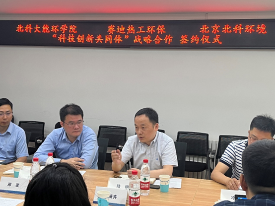 北科大能環(huán)學院邢奕院長致歡迎詞。他對賽迪熱工環(huán)保、北科環(huán)境一行的到來表示歡迎,并介紹了學院的基本情況以及科研建設(shè)成果情況。他指出本次三方合作目標為促進共同發(fā)展,圍繞前瞻技術(shù)創(chuàng)新、應(yīng)用技術(shù)攻關(guān)、核心裝備開發(fā)、科技成果轉(zhuǎn)化、產(chǎn)業(yè)化推廣合作、高端人才培養(yǎng)等領(lǐng)域組建“科技創(chuàng)新共同體”,開展全面合作。