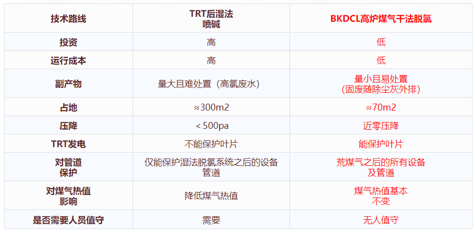 BKDCL高爐煤氣干法脫氯技術(shù)與TRT后濕法噴堿關(guān)鍵指標(biāo)對比: